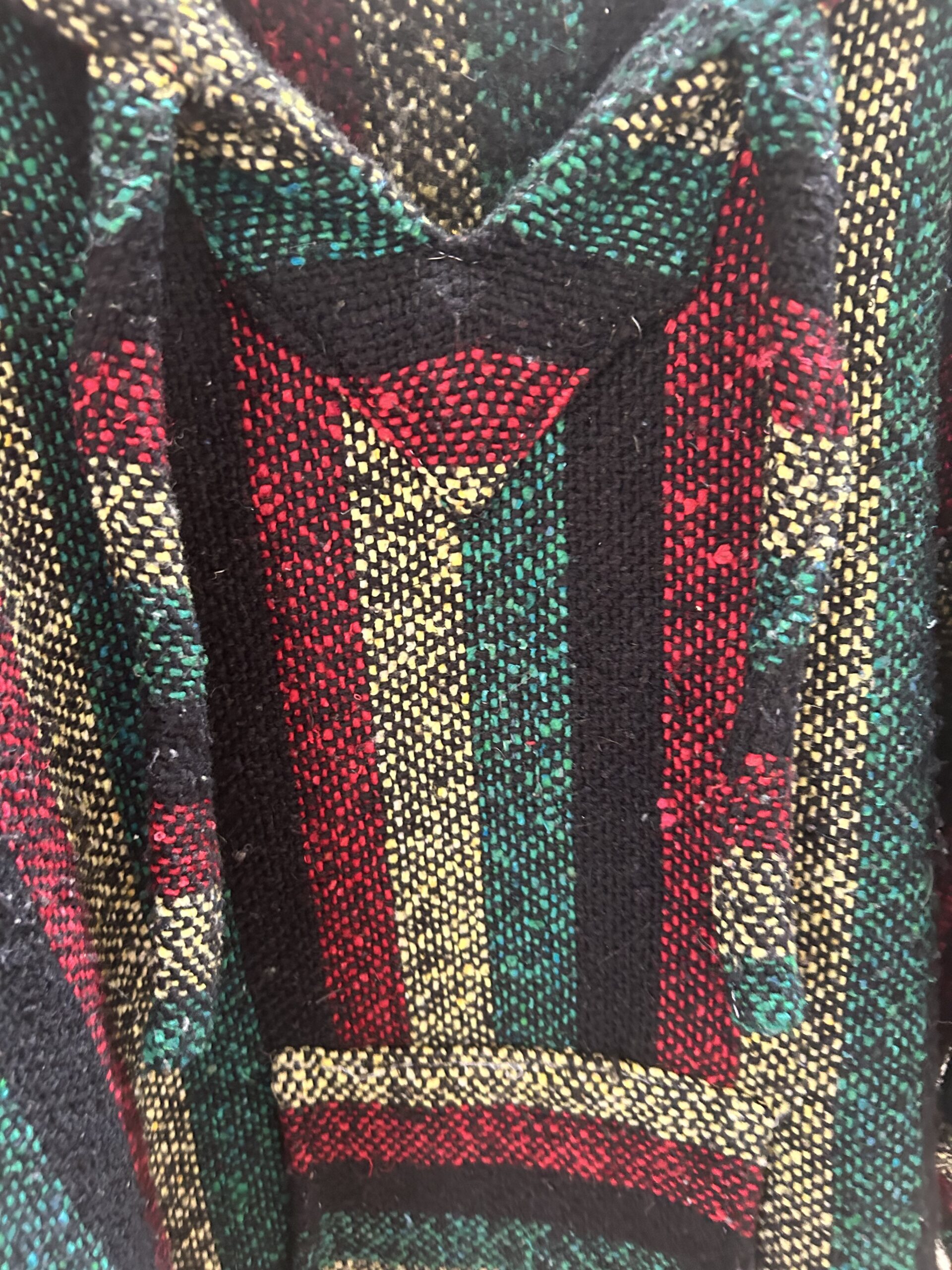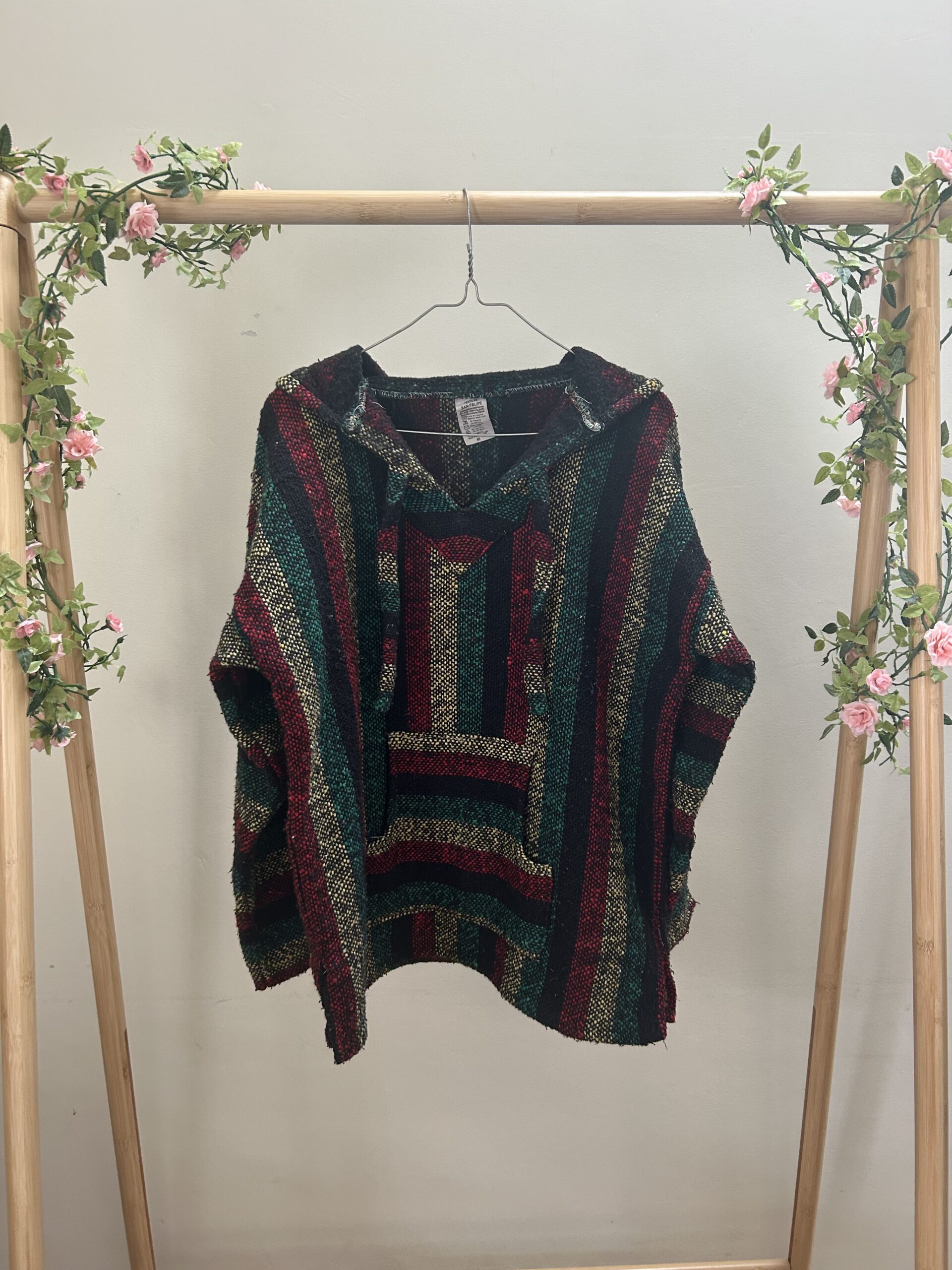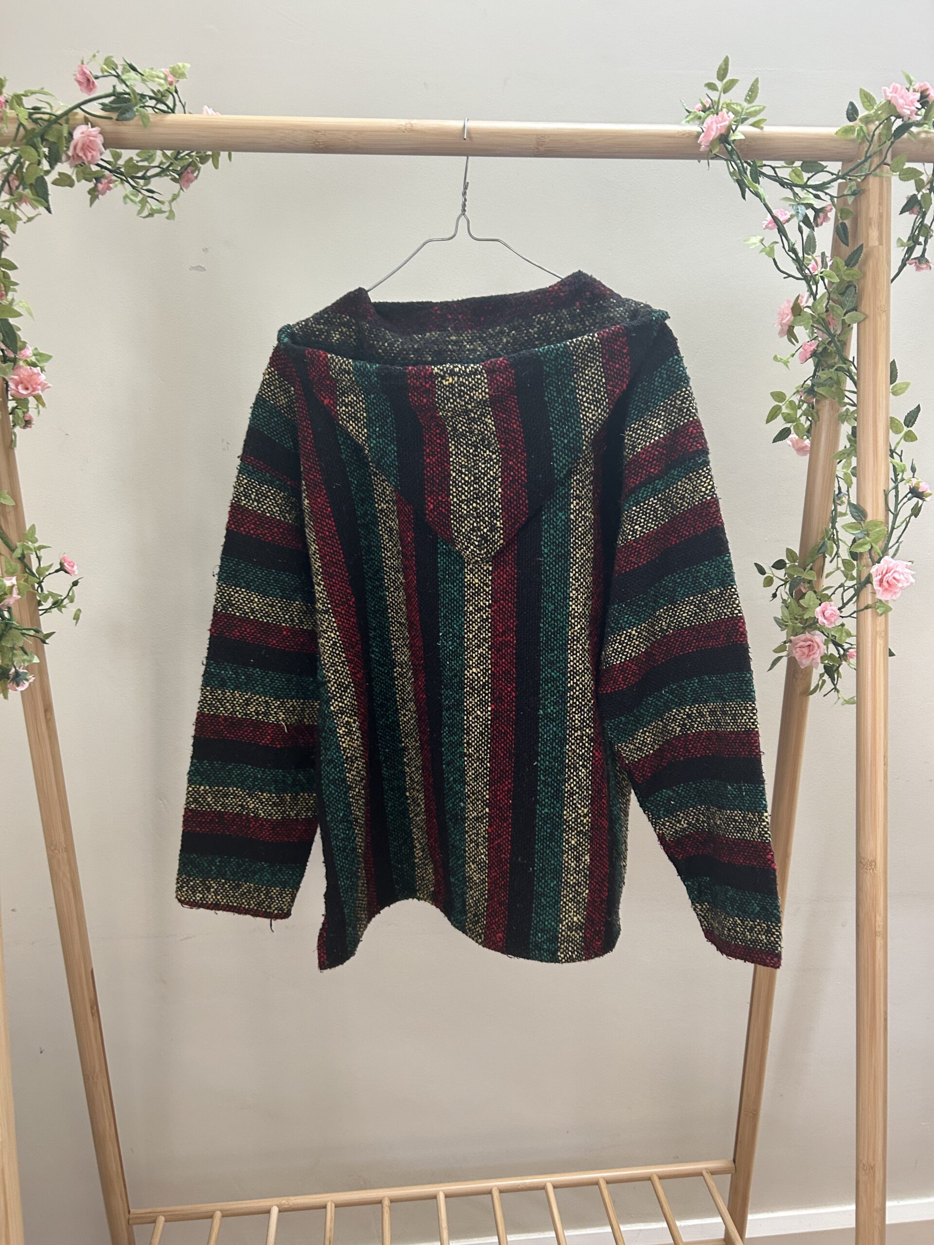Add a pop of retro charm to your wardrobe with this multicolor vintage Baja hoodie, featuring earthy stripes in deep forest green, burgundy, mustard and black. Crafted in the traditional thick, textured weave, this cozy pullover has a relaxed, slouchy fit, front pouch pocket, and a hooded neckline. A boho- grunge staple that’s made for both comfort and character.