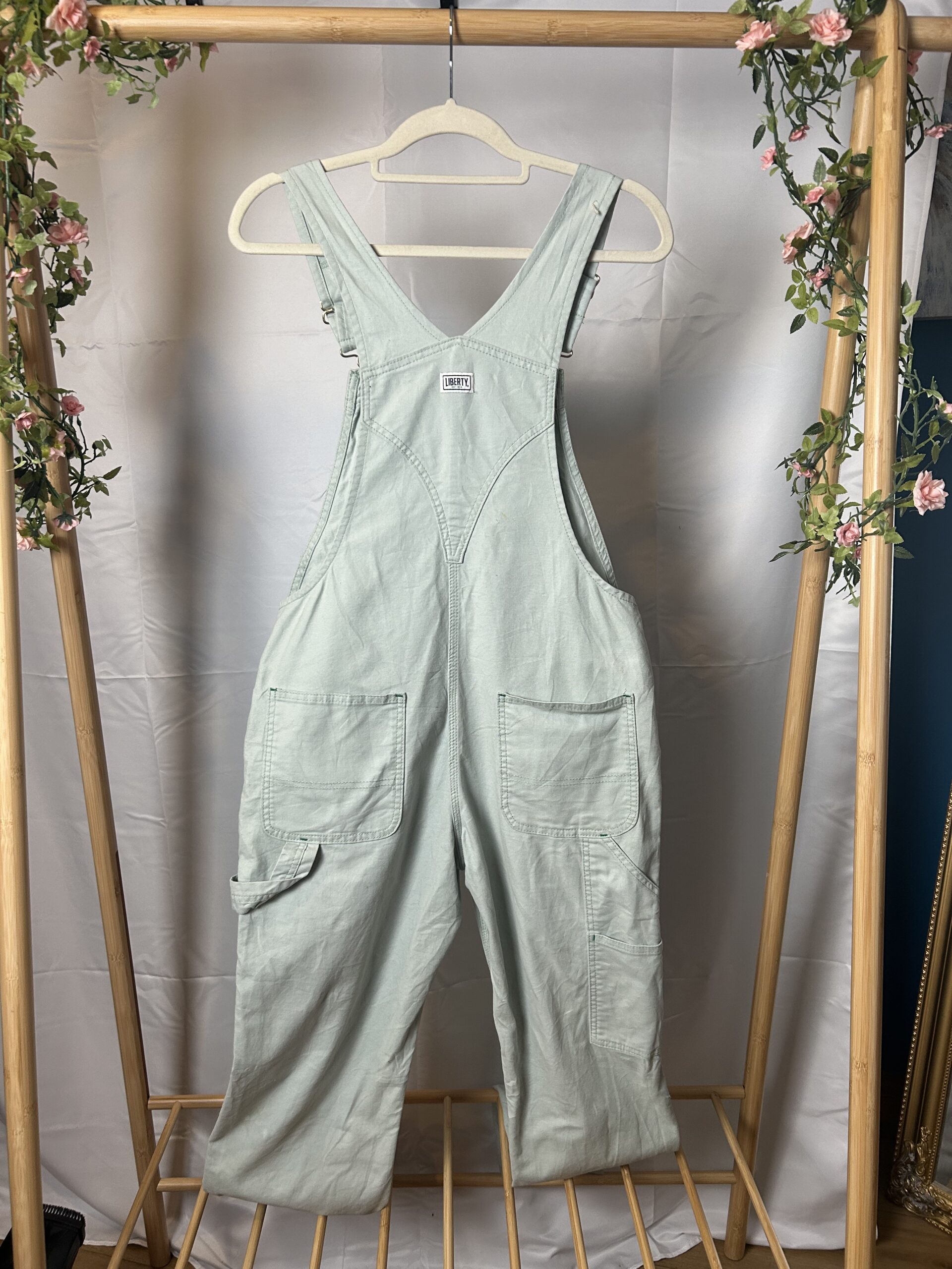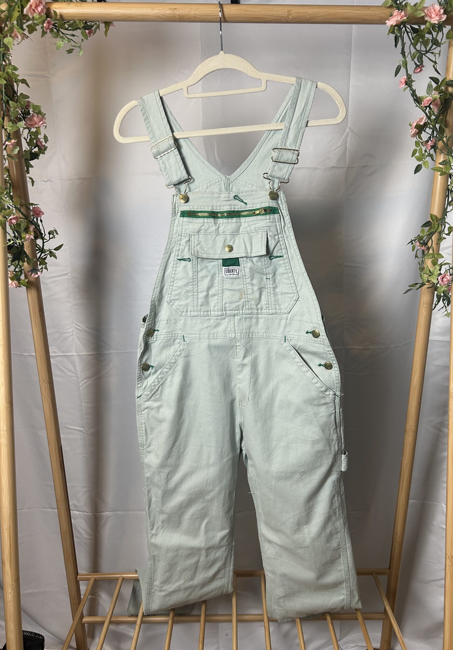 These workwear-inspired overalls by Liberty are made from a canvas or light denim material in a faded, soft mint green or light sage color. They feature traditional overall details, including adjustable shoulder straps and a spacious front bib pocket. The front bib is accented with a contrasting green zipper, adding a pop of color.