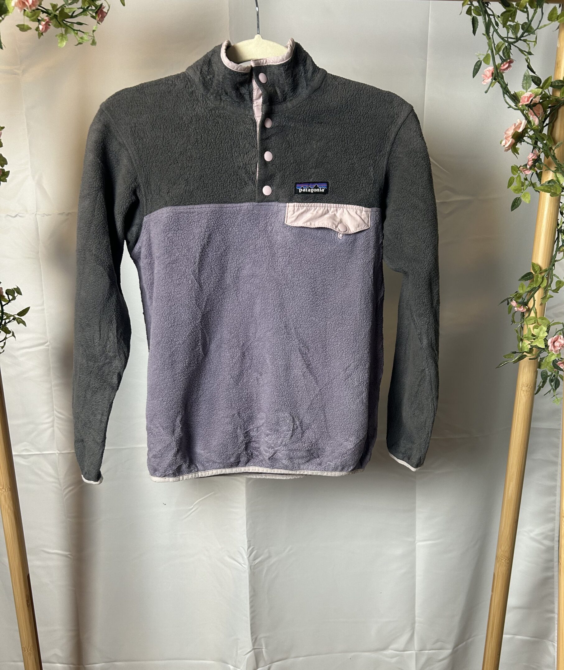 This cozy fleece pullover from Patagonia features a modern colour-block design, combining a charcoal grey yoke and sleeves with a soft lavender/lilac body. It includes a classic four-snap placket, a stand-up collar, and a single breast pocket. The details, including the pocket flap and snap trim, are accented with pale pink, adding a subtle feminine contrast.