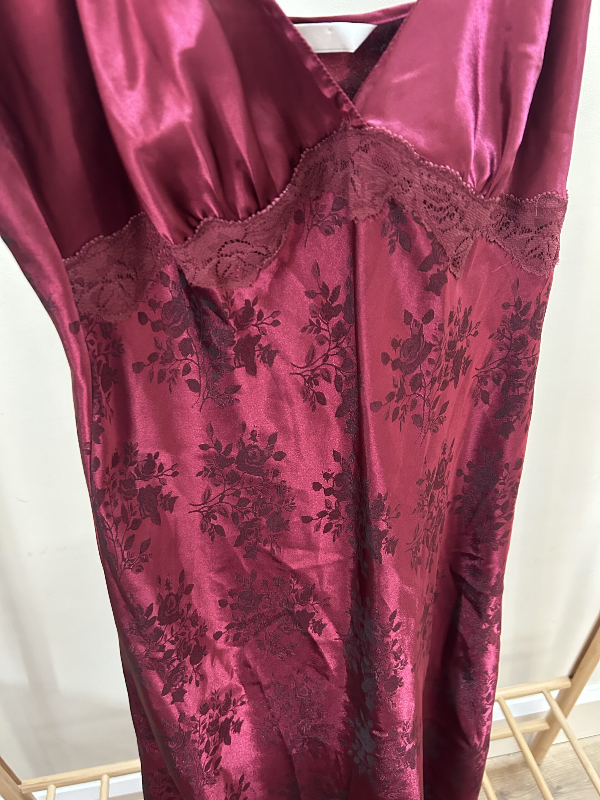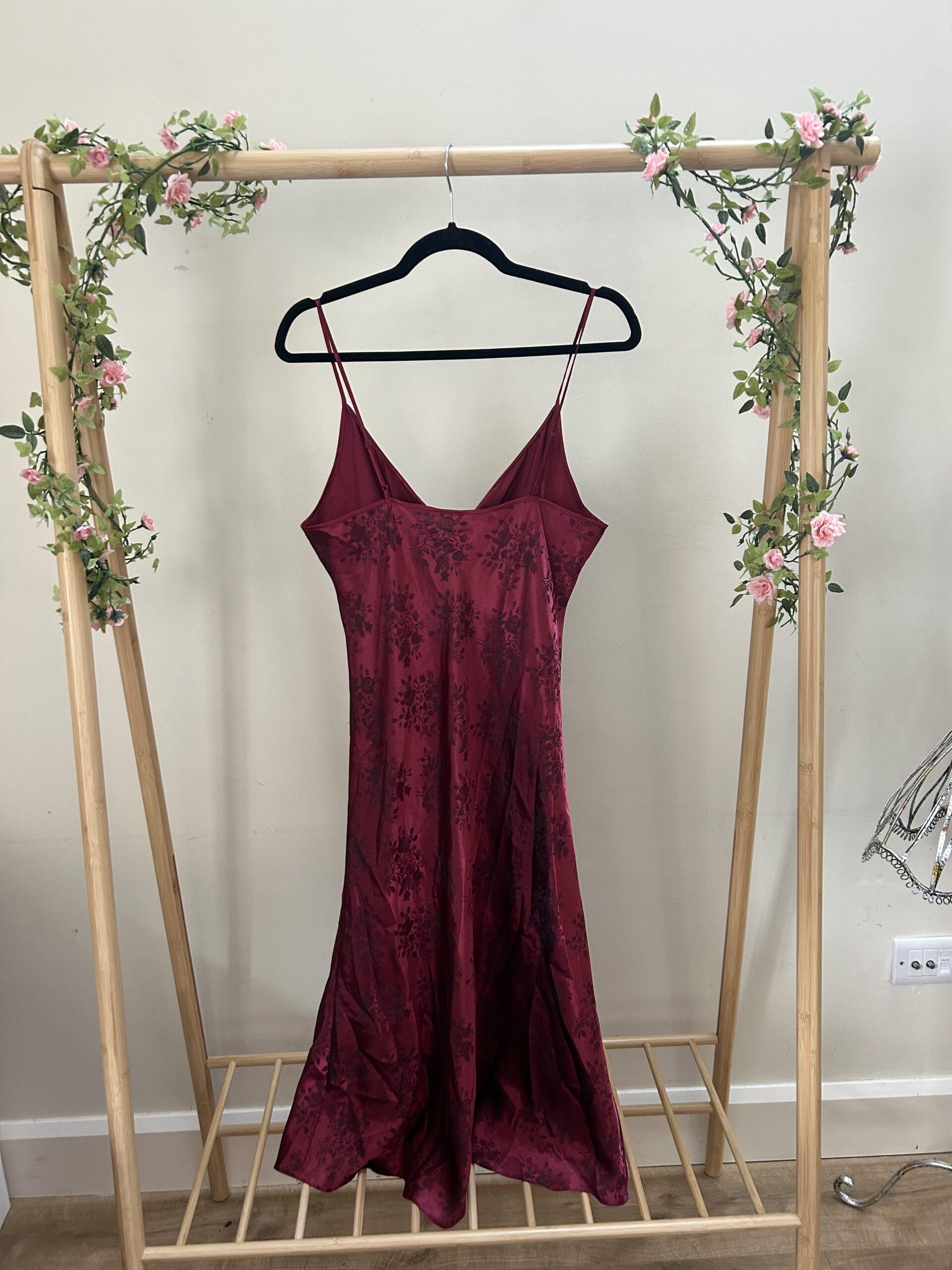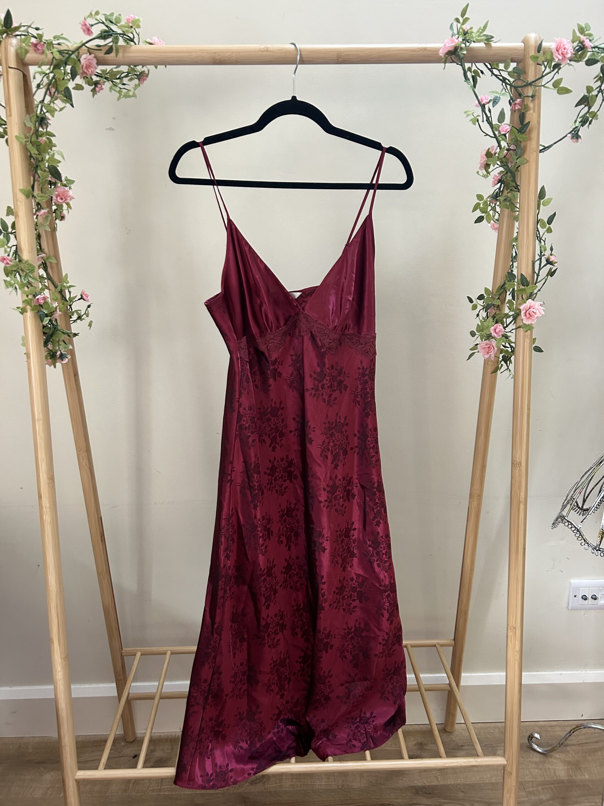 Step into a dream with our ‘Crimson Rose’ slip dress. This exquisite piece features a rich, deep crimson fabric with a stunning floral jacquard pattern that catches the light with every movement. The delicate spaghetti straps and a subtle v-neckline are trimmed with intricate lace, adding a touch of romance. It’s a timeless silhouette that gracefully skims the body, offering both elegance and a hint of allure.