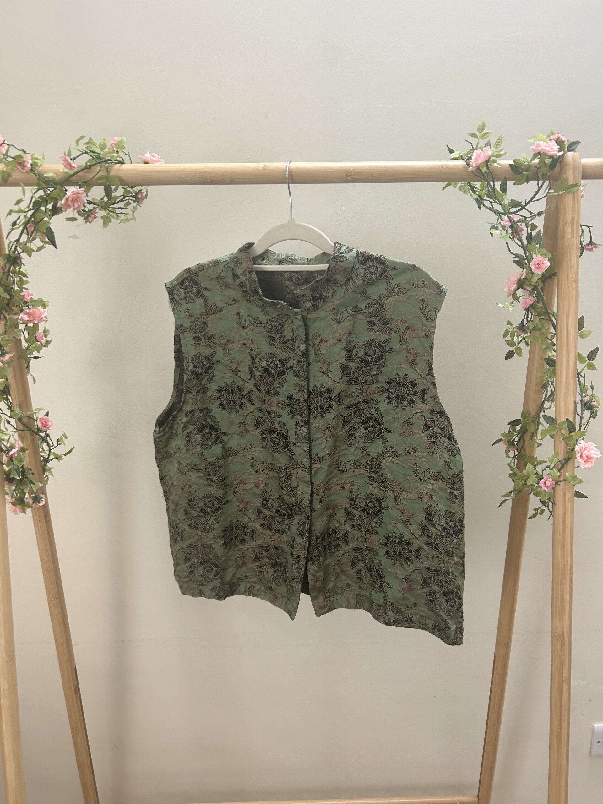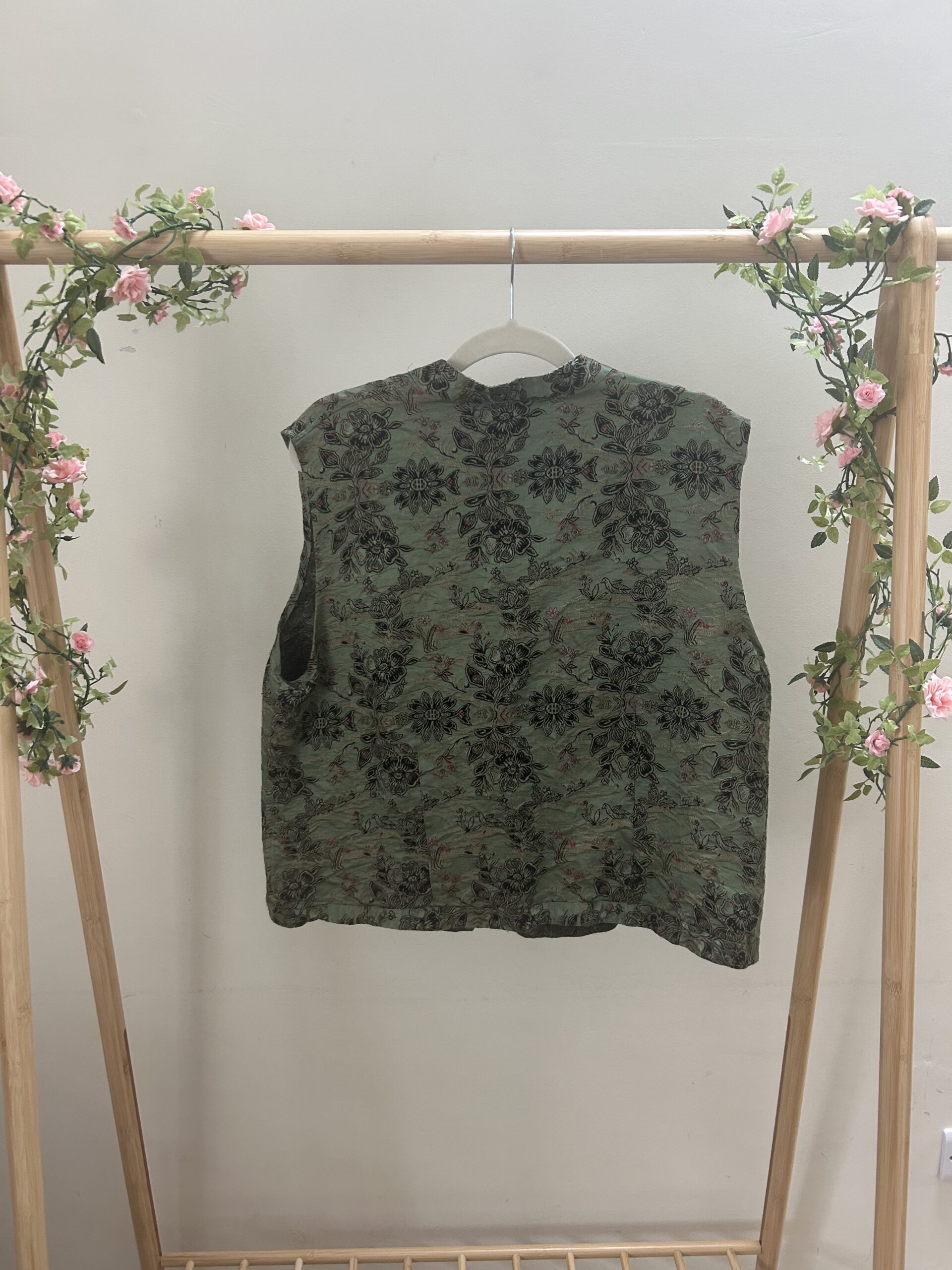 This beautiful vintage vest offers a touch of timeless elegance with its stunning Asian-inspired brocade fabric. The piece features a delicate, all-over floral pattern in black and subtle gold threads against a soft, sage-green background. With a mandarin collar and a simple button-down front, it has a classic, structured silhouette that’s perfect for layering. This vest is a unique and sophisticated addition to any wardrobe, blending traditional style with vintage flair.