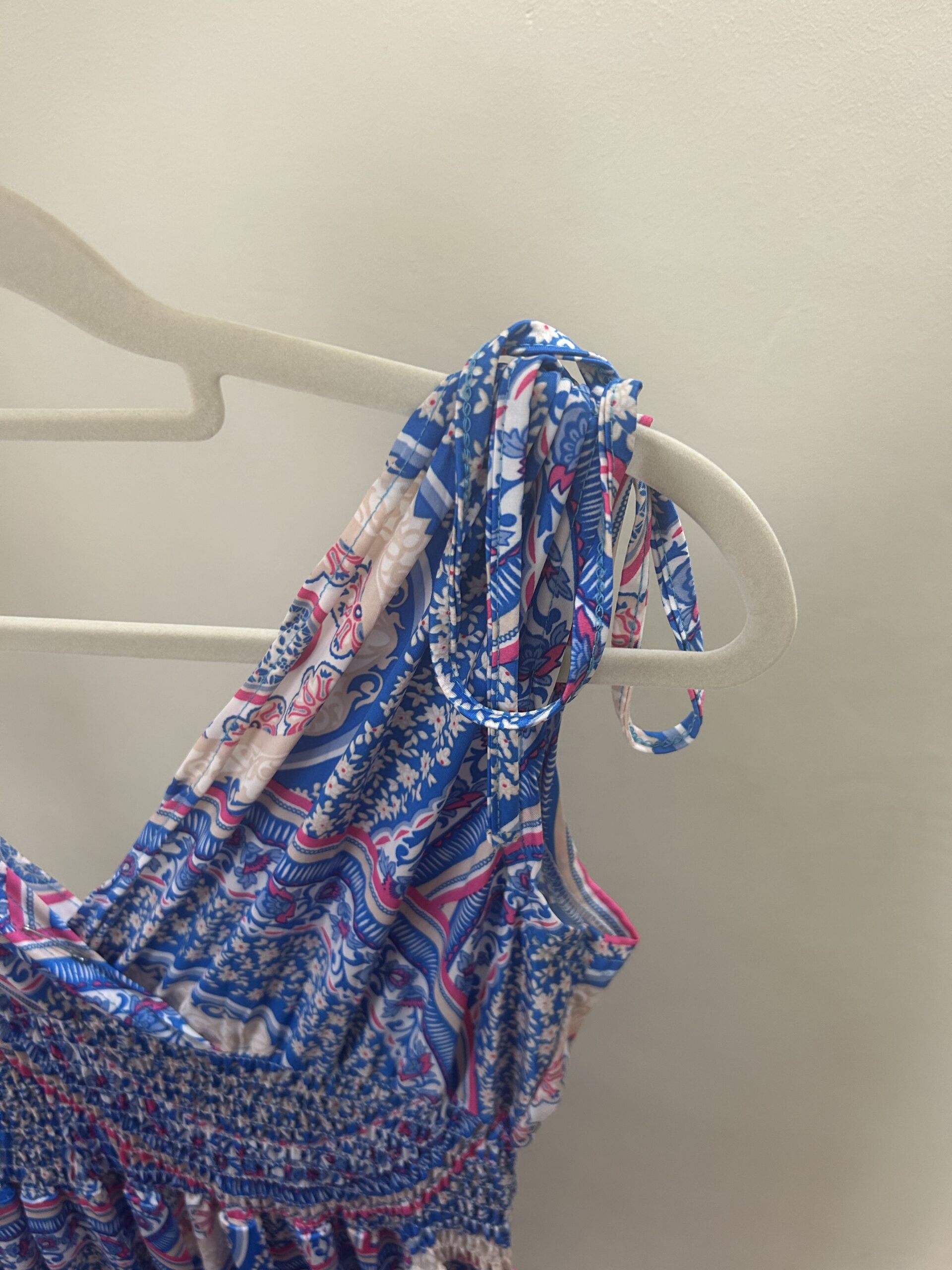 This striking vintage jumpsuit is a showstopper, blending comfort with a vibrant bohemian aesthetic. The piece features a beautiful, intricate medallion and paisley print in a captivating color palette of cobalt blue, bright pink, and white. The elasticated, smocked bodice creates a flattering, fitted silhouette while the relaxed, wide-leg trousers offer comfort and flow. With adjustable shoulder ties, this one-piece is perfect for a stylish, carefree look.