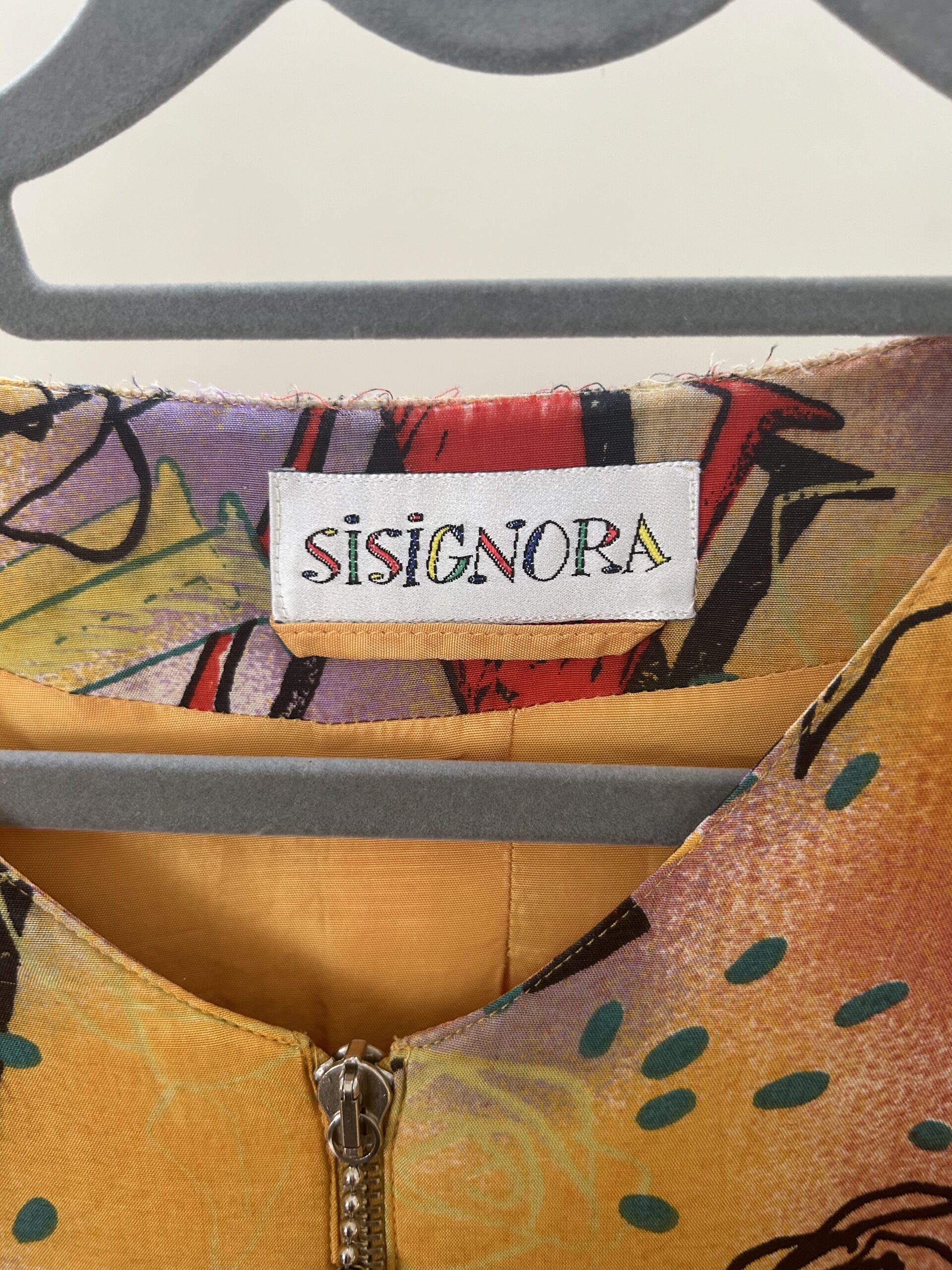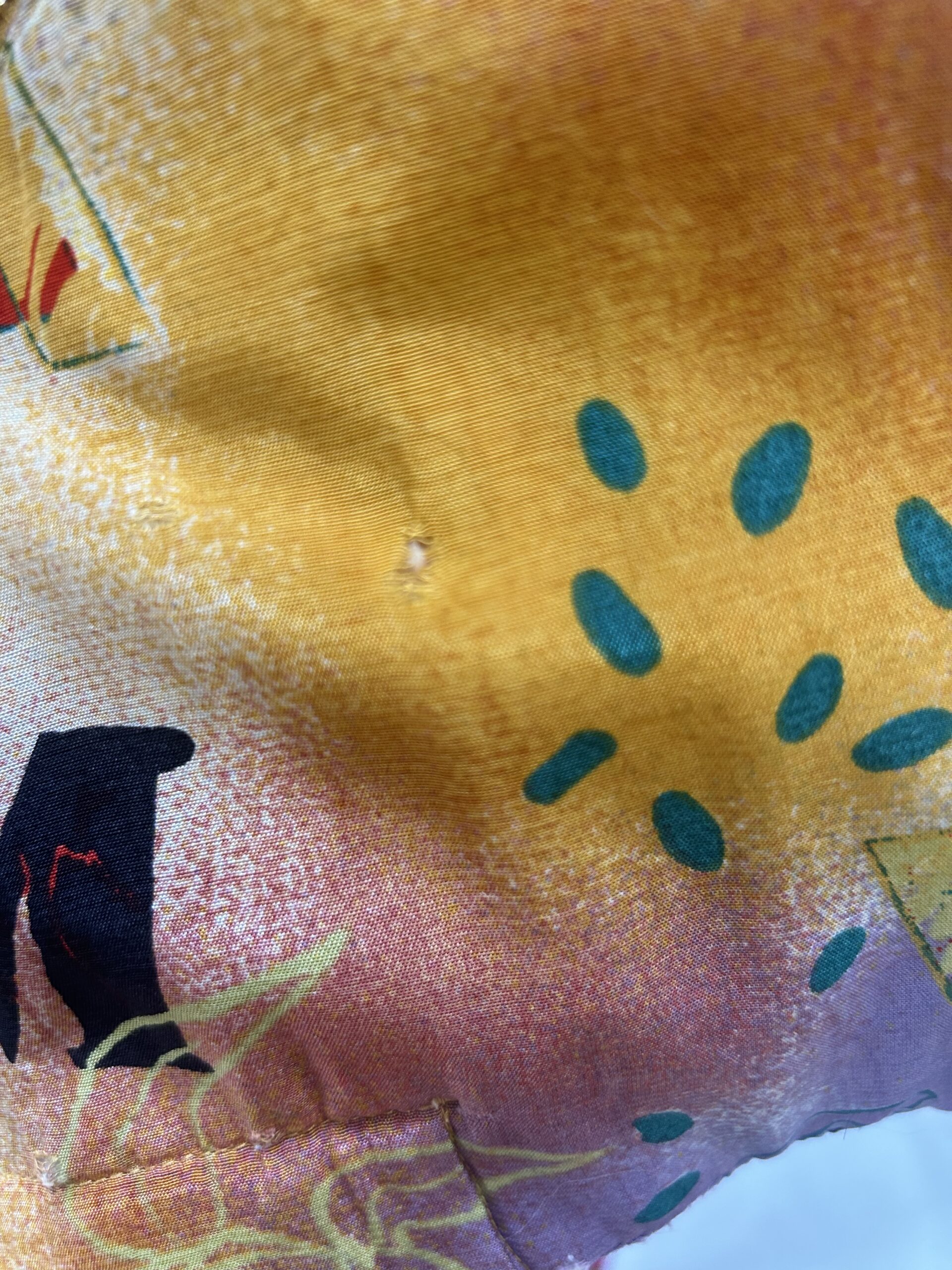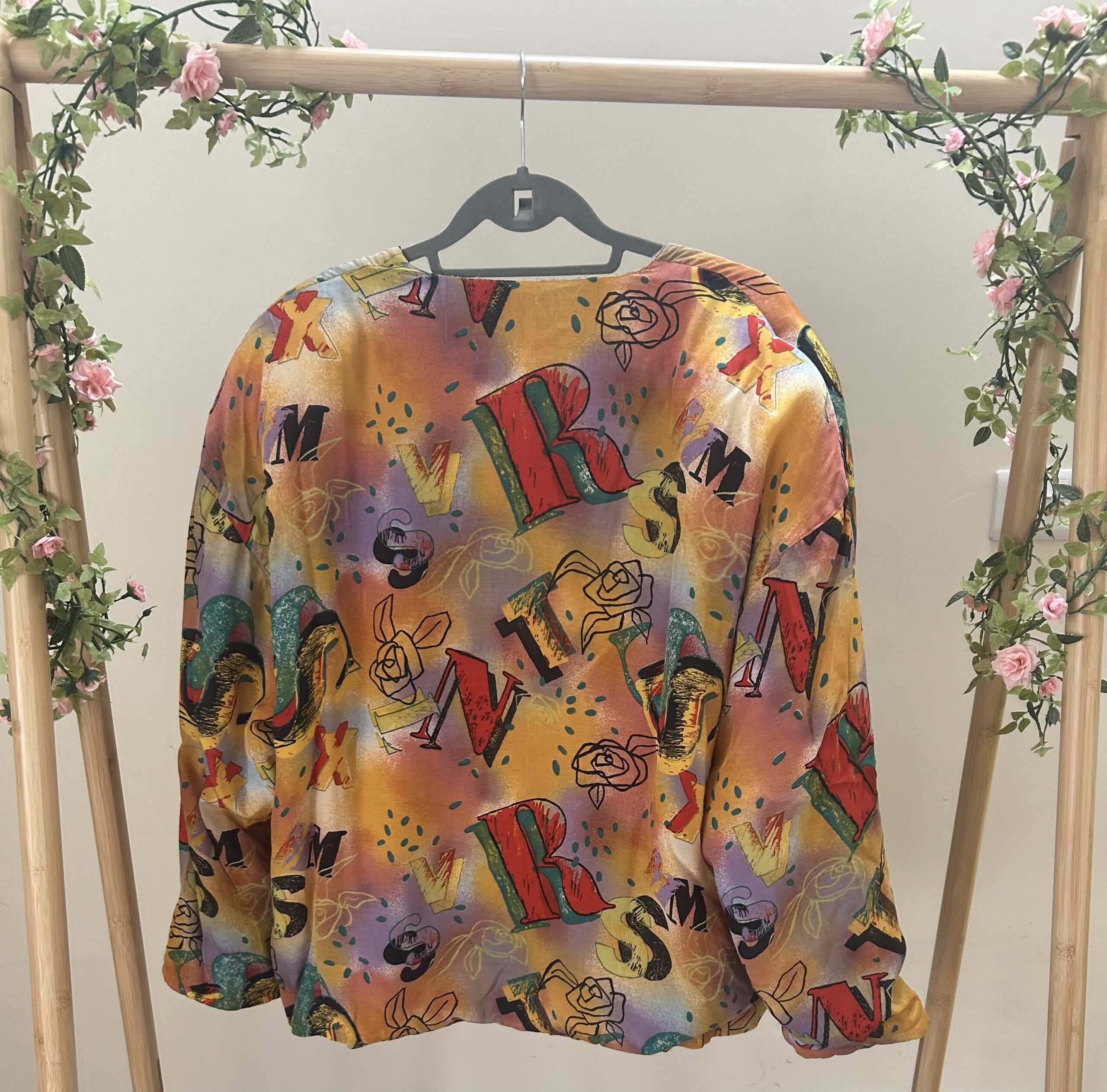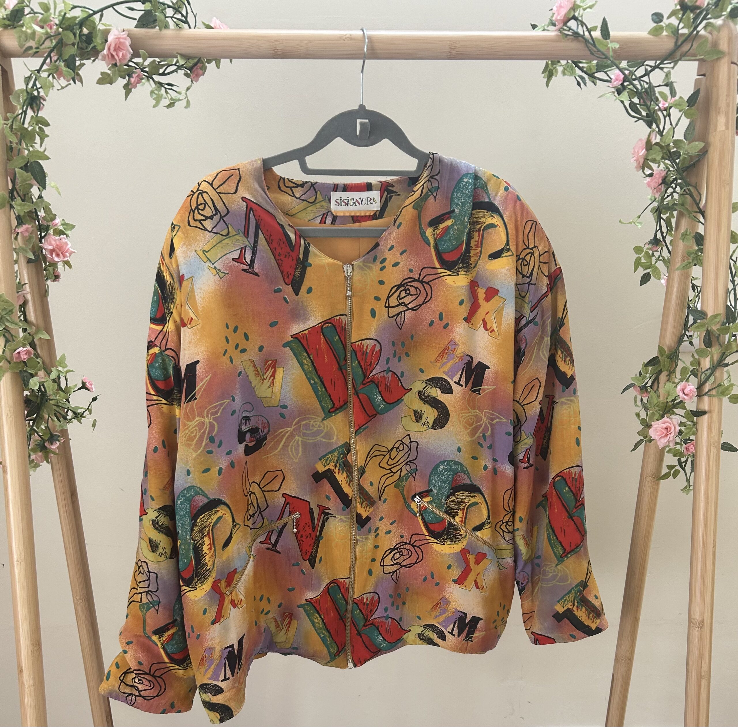 Make a bold artistic statement with this vibrant vintage jacket. It features an expressive, all-over graffiti-style print with splashes of yellow, orange, and red, overlaid with bold lettering and abstract black line drawings of roses and shapes. The full-zip front and lightweight fabric make it a versatile piece for layering. This jacket is the perfect way to add a touch of colourful, rebellious energy to your wardrobe.