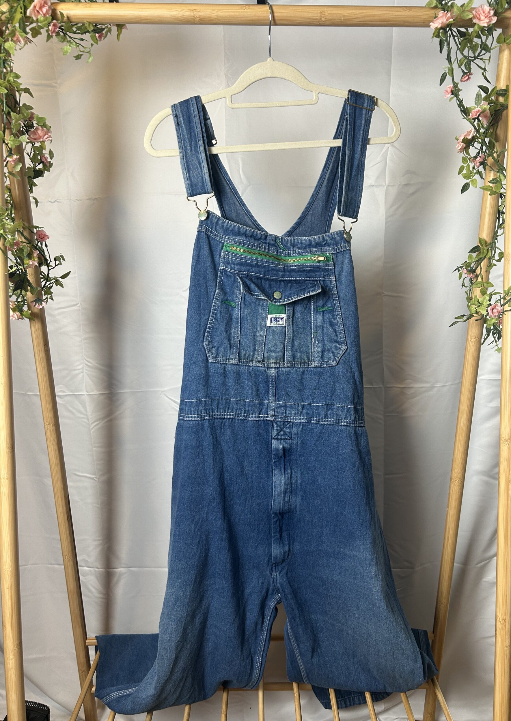 These classic denim overalls from the workwear brand Liberty are crafted in a medium blue wash. They feature all the traditional overall details, including adjustable shoulder straps and a spacious front bib pocket. A unique detail is the bright green zipper on the front bib pocket, providing a functional pop of color and retro charm. The fit appears relaxed and straight-legged, ideal for a comfortable, casual look.