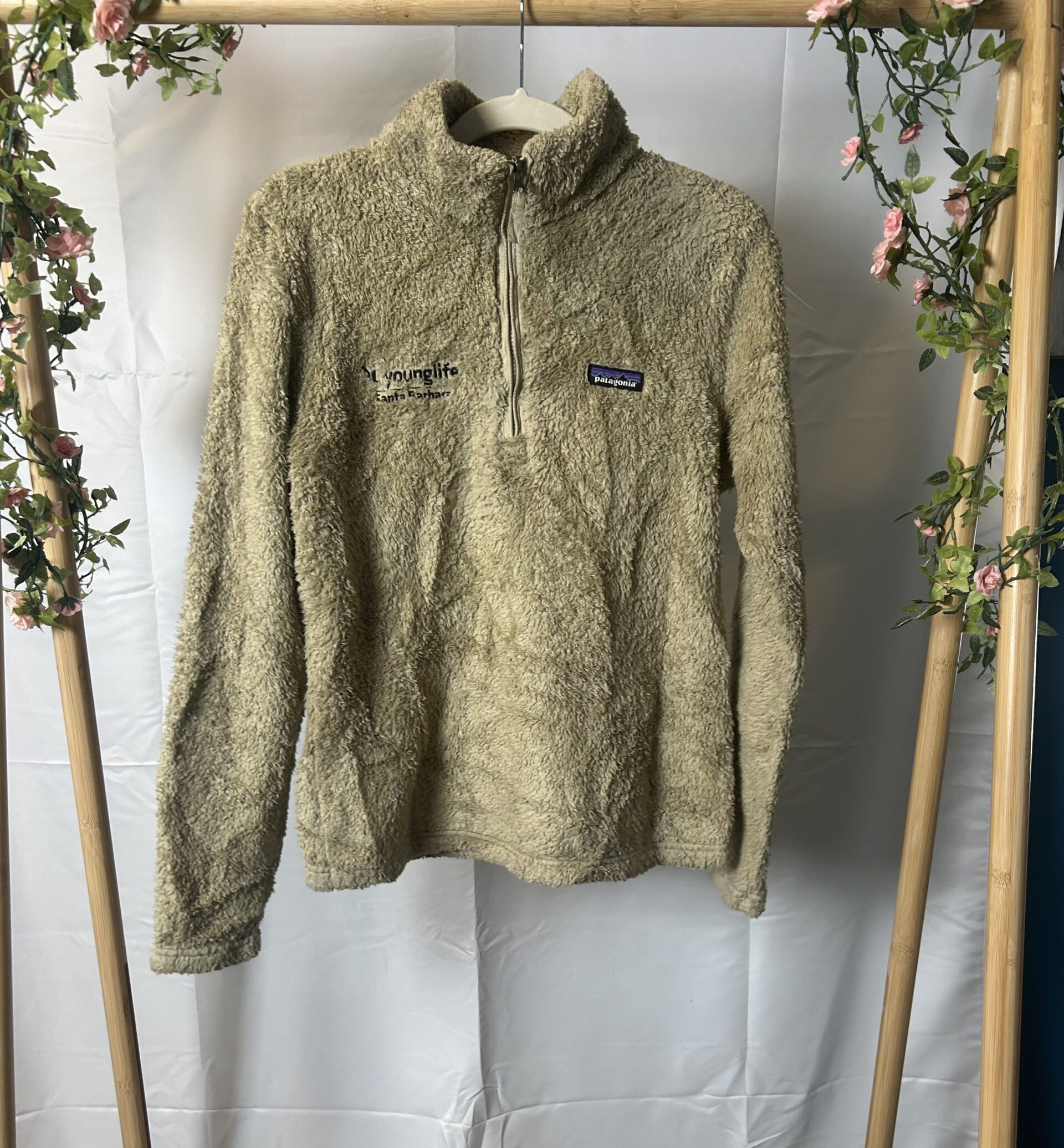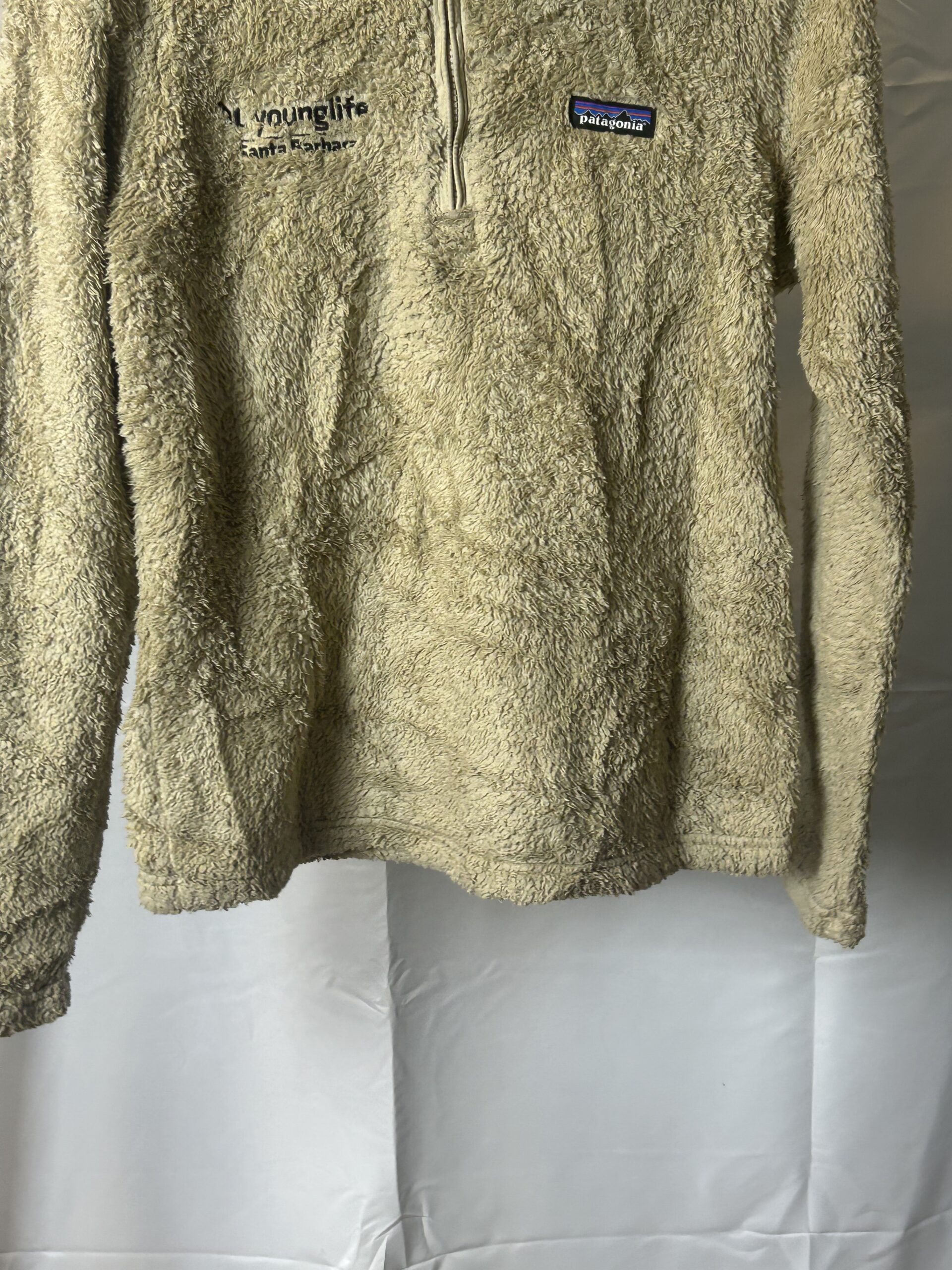 Get cozy with this exceptionally soft vintage fleece from Patagonia. This quarter-zip pullover is crafted from a warm, high-pile shaggy fleece in a natural khaki/tan color. It features a mock neck and a small Patagonia logo patch on the chest, along with simple embroidered text, indicating it may be an exclusive corporate style. This is the ultimate comfortable layering piece for chilly weather.