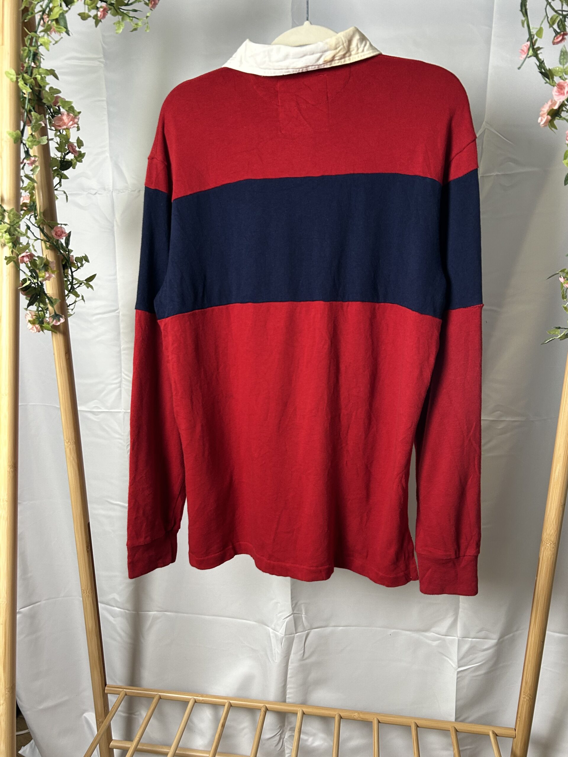 Style Tip: This piece perfectly anchors a preppy or streetwear look. Pair it with dark trousers or khaki chinos and loafers for a classic heritage aesthetic. For a relaxed, streetwear-inspired vibe, wear it slightly oversized with light-wash jeans and vintage trainers, allowing the collar stain to blend into a casual, worn-in style.