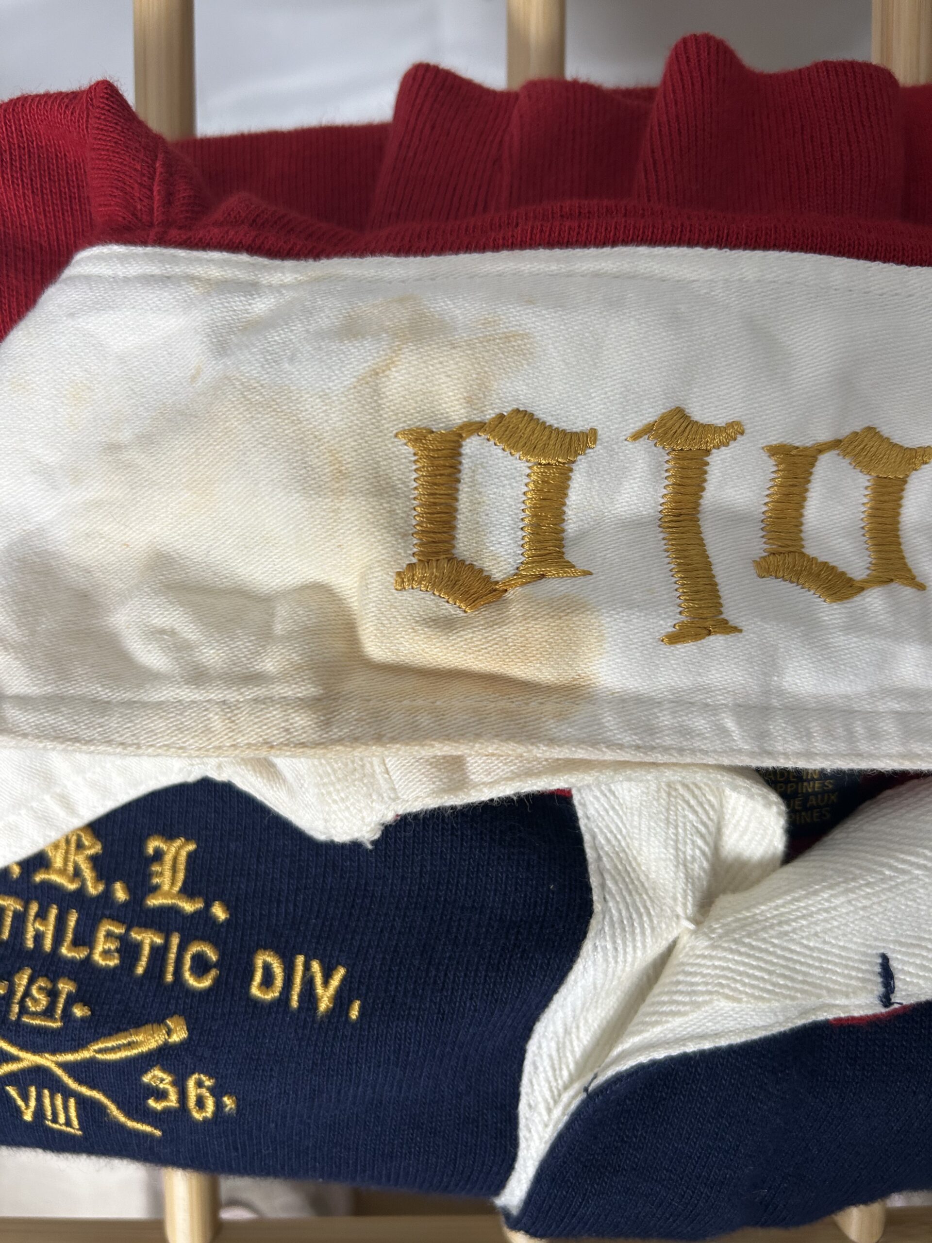 This iconic vintage Polo Ralph Lauren rugby shirt is a statement in classic Americana and sportswear heritage. It features a bold red and navy blue colour-block design with a crisp white collar. The chest is adorned with detailed collegiate-style embroidery, including a patch that reads “P.R.L. 2ND ATHLETIC DIV.” and a crest with a playing bear graphic.